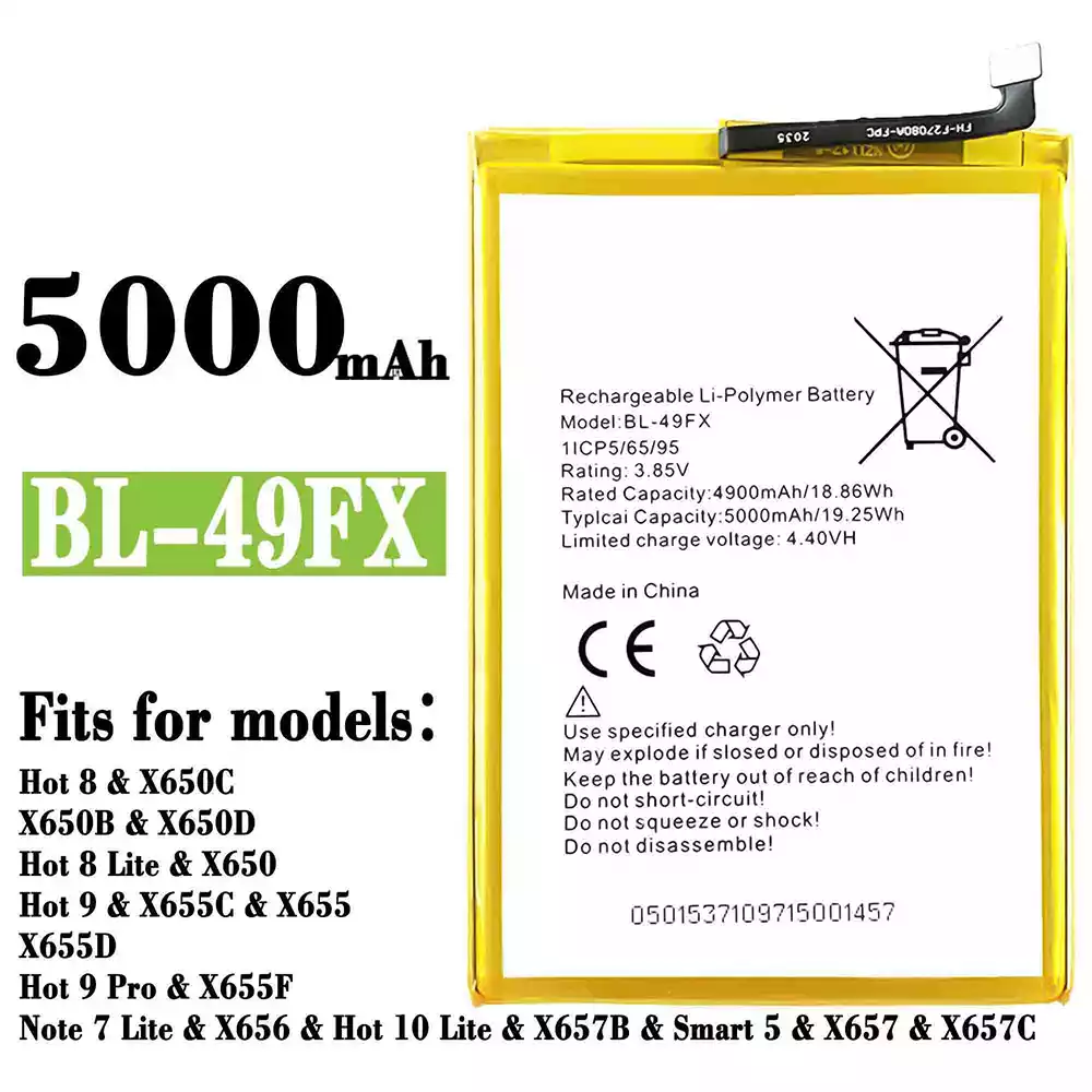 Battery BL-49FX for Infinix Hot 8 / X650C / X650B / X650D /Hot 8 Lite / X650 / Hot 9 / X655C / X655 / X655D / Hot 9 Pro / X655F / Note 7 Lite / X656 / Hot 10 Lite / X657B / Smart 5 / X657 / X657C